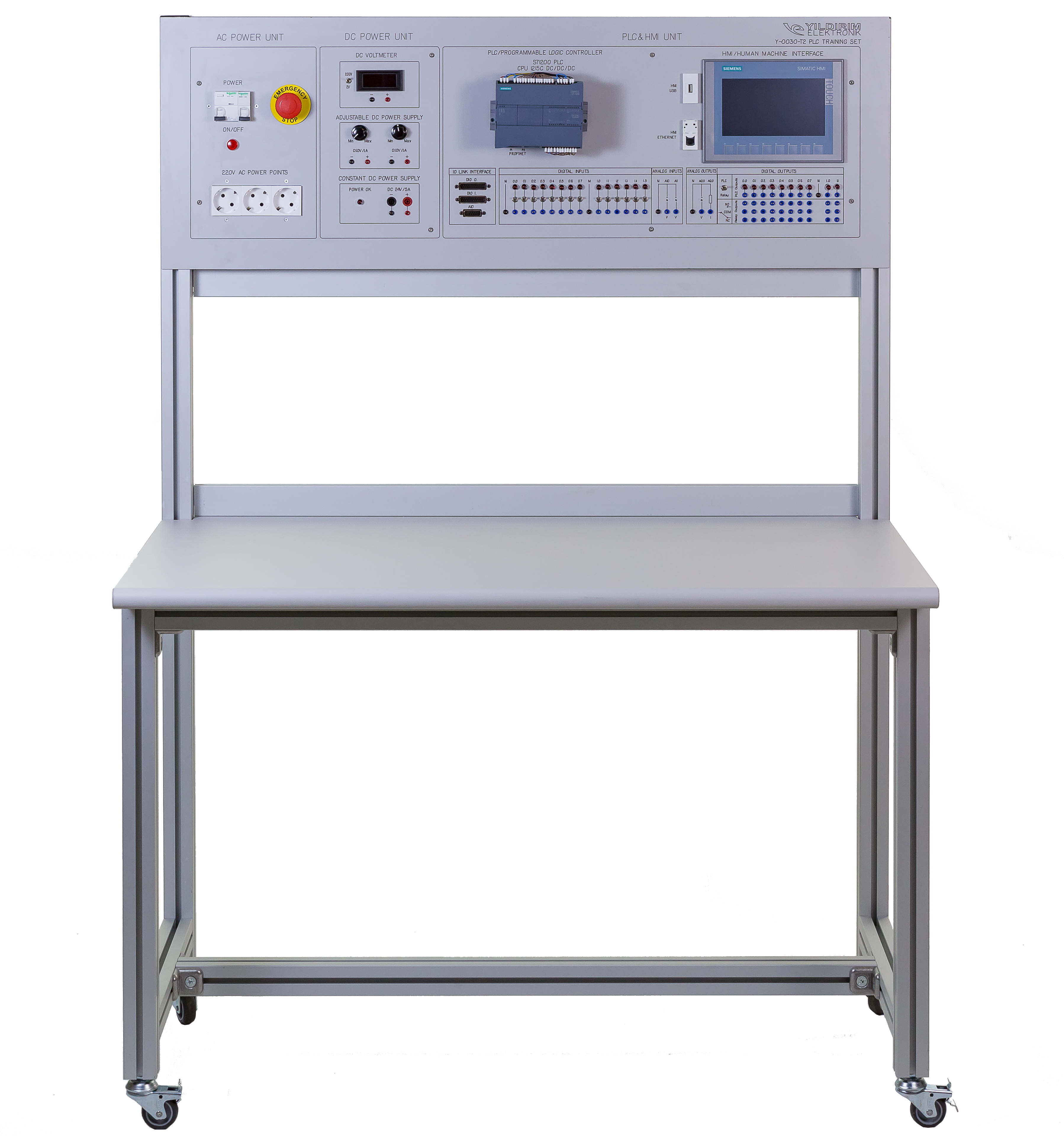 All components on the set meet the safety requirements.Simulation keys, signal lambs and 0…10V adjustable power supplies can be used for digital and analog inputs– outputs applications with PLC. Digital outputs can be used directly or over relays. Set includes 2 mm input and output sockets to connect any external system to PLC directly. Voltage of the digital and analog inputs – outputs can be displayed by voltmeter on the panel.Multiple network connections can be done by industrialethernet switch on the panel.