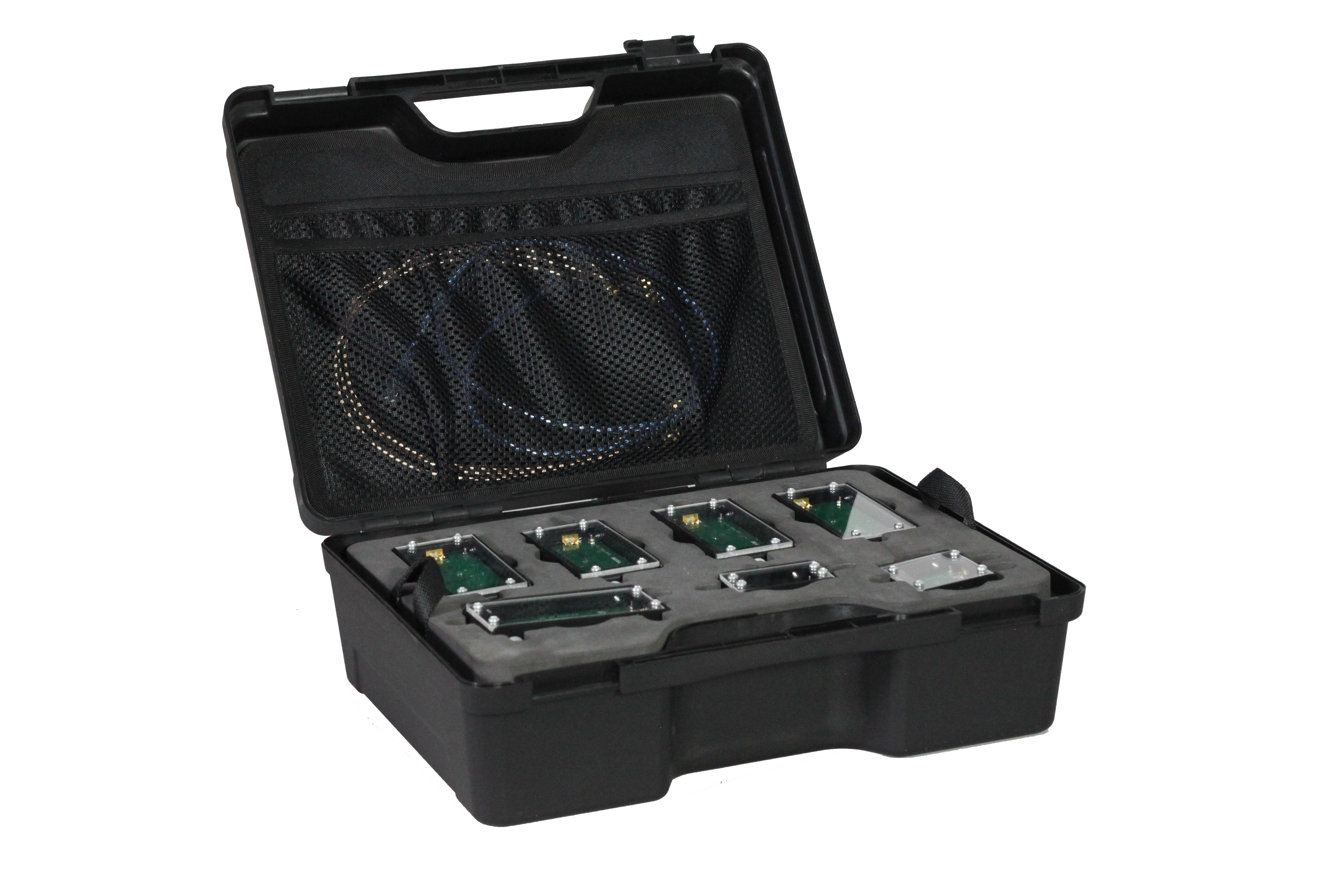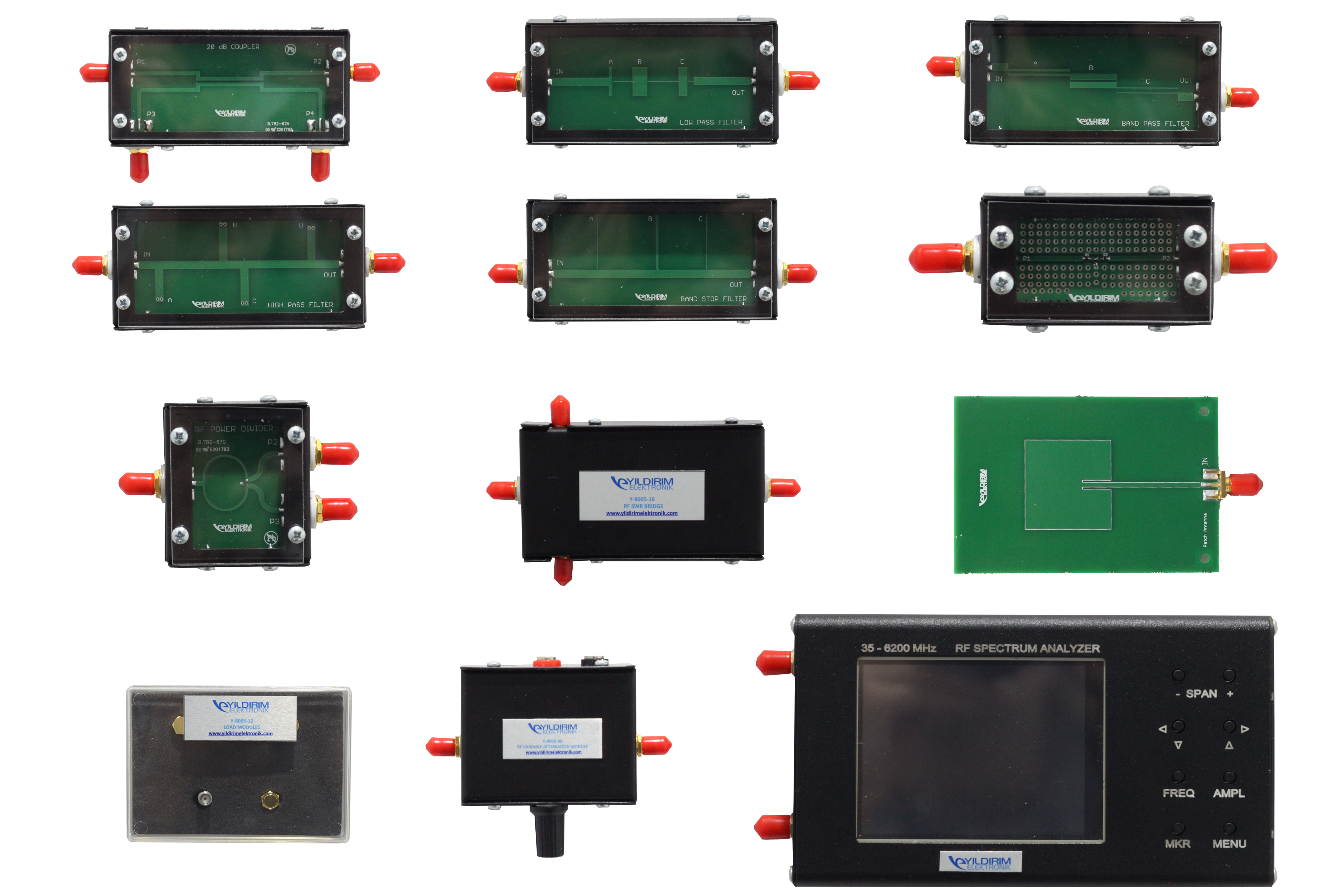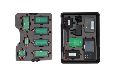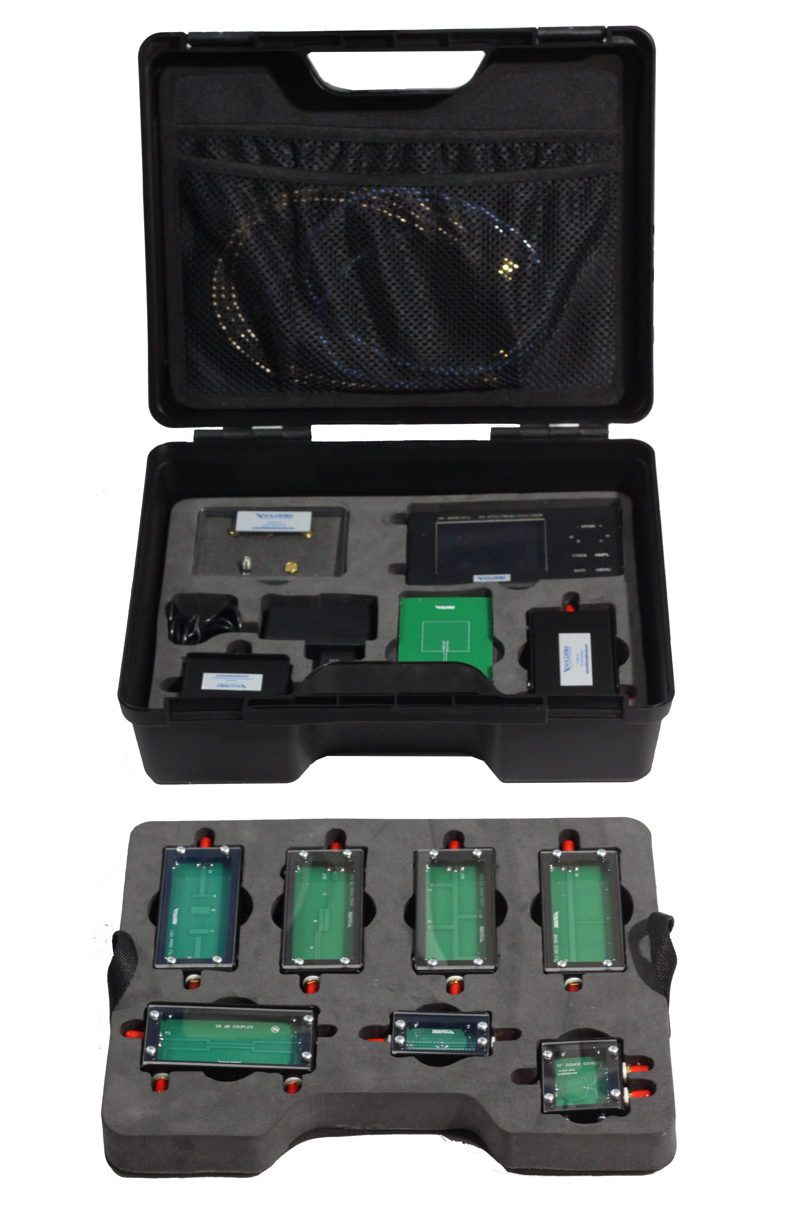 Set includes High Pass Filter, Low Pass Filter, Band Pass Filter, Band Stop Filter, RF Divider, RF Coupler, RF Attenuator, RF Voltage Variable Attenuator, RF SWR Bridge, Microstrip Patch Antenna modules and Portable Spectrum Analyzer has Tracking Generator oputput. (TG is optional)