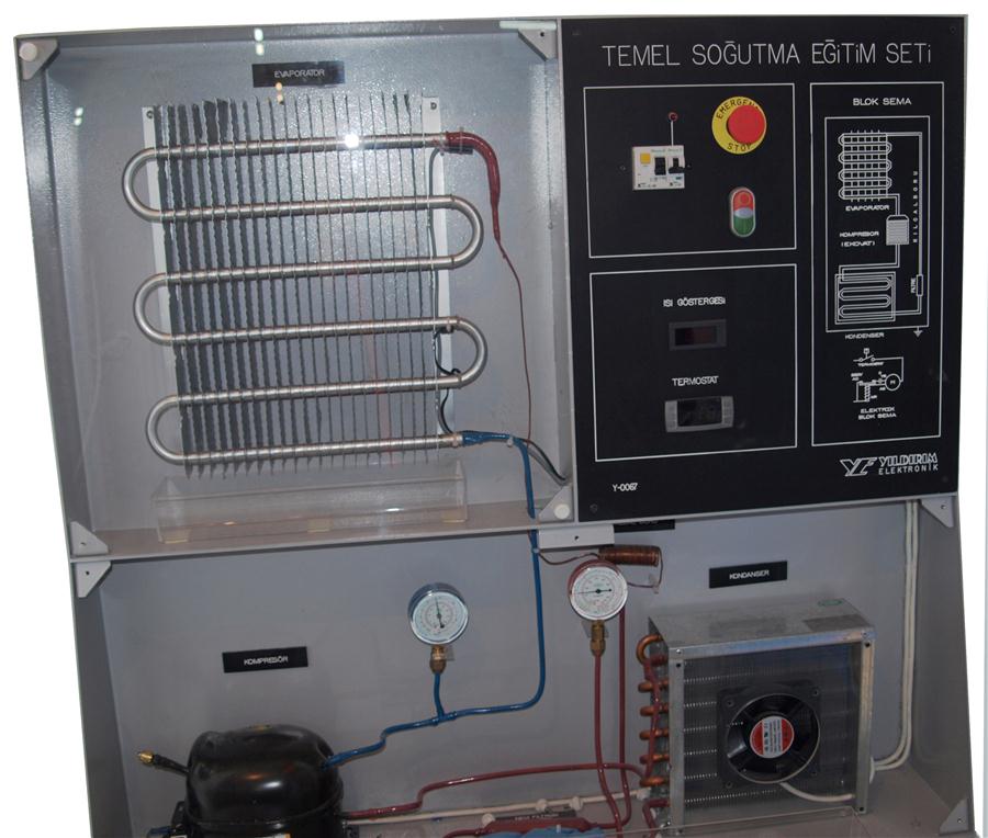 2) Eğitim seti; soğutma sistem yapısı, çalışması ve teorisinin gözlenmesi, basınç - sıcaklık ilişkisi, oluşan arızaların tespiti - giderilmesi, devre elemanlarının tanınması ve uygulamalı eğitime yardımcı olacak tasarımda olmalıdır.