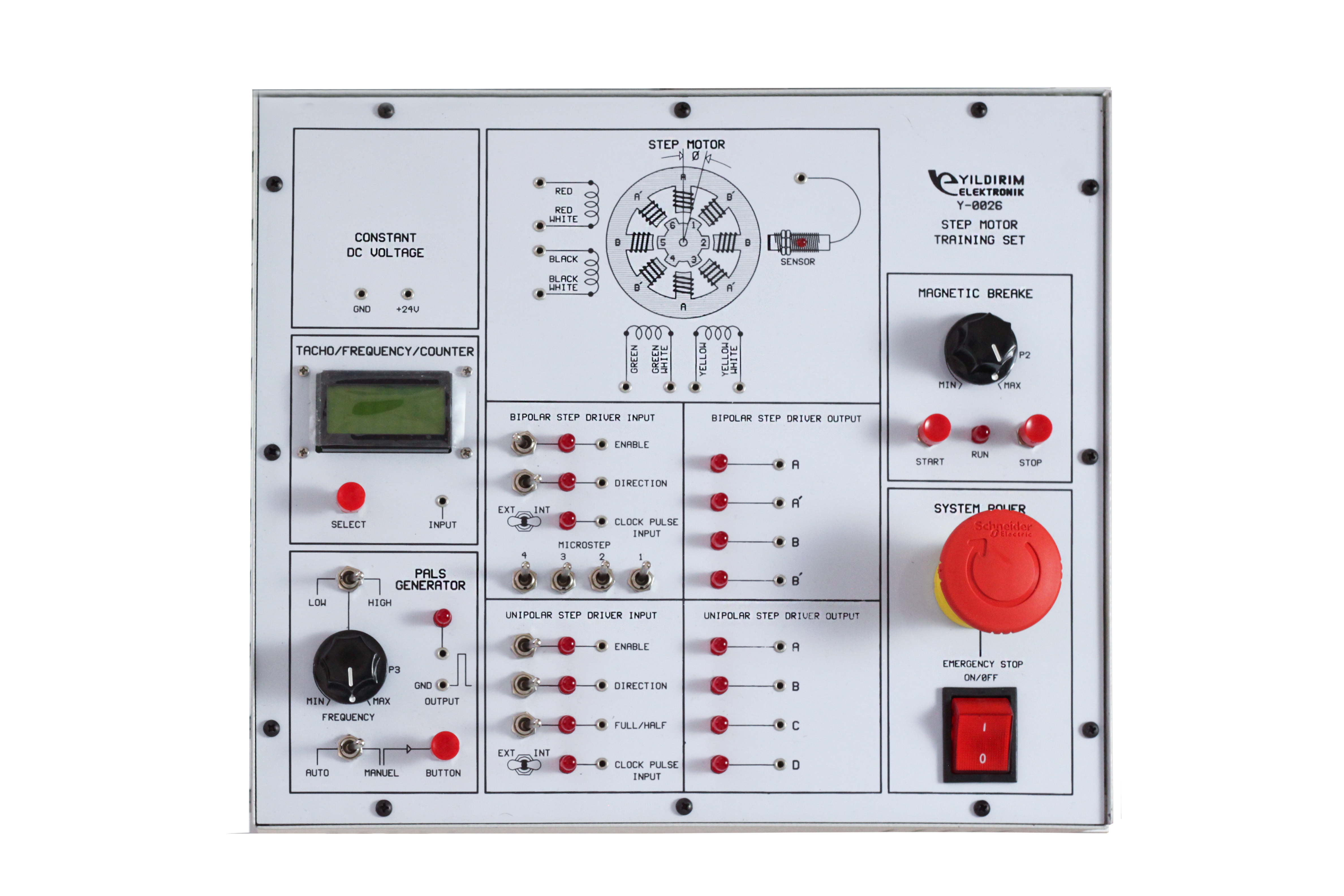 Step motorun sürülmesi ve kontrolü ile ilgili eğitim konularını kapsayan eğitim setidir. Set üzerinde step motora, triger kayış ile akuple edilmiş manyetik toz fren kullanılmıştır. Böylece step motorun yük altındaki pozisyonlama ve hız karakteristikleri incelenebilmektedir.
