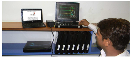 display board. It helps the doctors to take quick decision in favor of the patient when there is no time for further analysis and treatment. These parameters includes ECG, HR, ST segment analysis, PVC's analysis, Respiration rate, Pulse rate, Body temperature, NIBP and SPO 2 measurement. Scientech Techbook 2365 Multi-parameter monitor is capable of monitoring seven parameters simultaneously over one window, with the help of only four sensors. Theses sensors are for ECG (Up to seven leads), Temperature, SPO and NIBP. Measurement 2 of respiration is done by ECG sensor (RA-LA impedance method) .