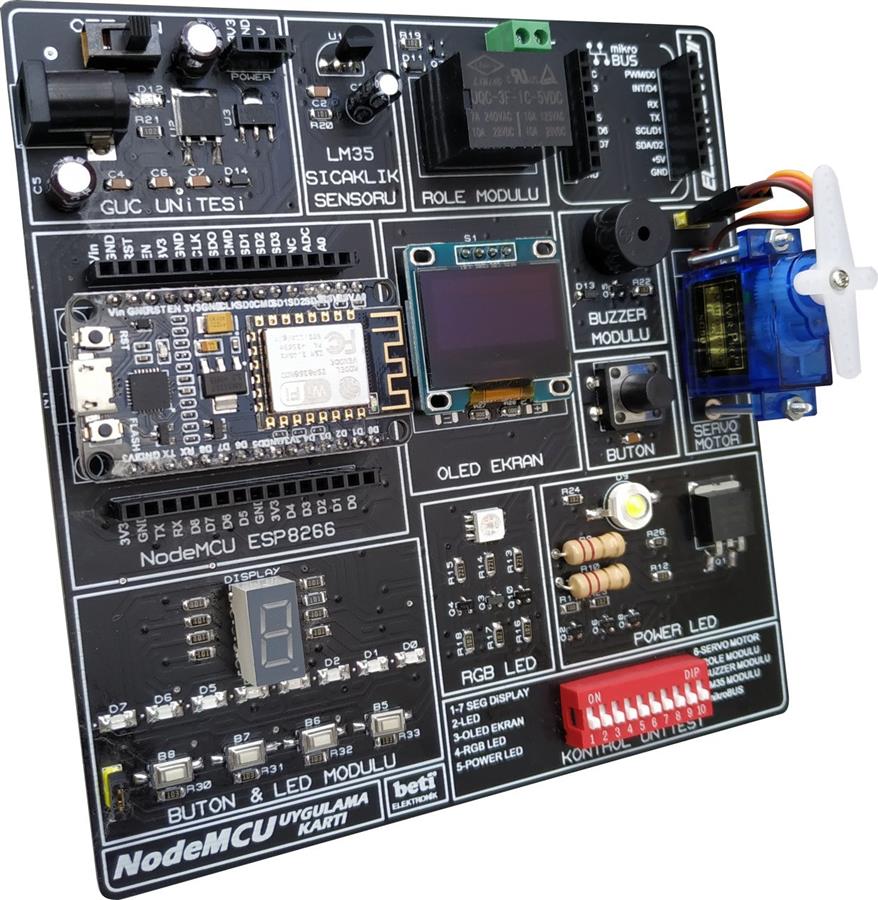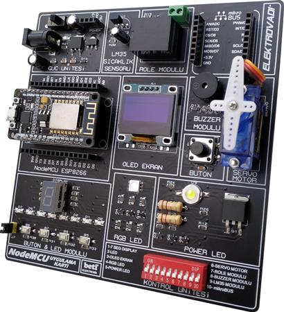 NodeMCU uygulama kartı, NodeMCU ESP8266 geliştirme kartı ile birlikte kullanılmak için tasarlanmış olan ve üzerinde farklı bir çok donanım barındıran bir eğitim seti olarak tanımlanabilir. NodeMCU Uygulama Kartı’nın tasarlanma amacı ESP8266 mikrodenetleyicisinin ülkemizde daha iyi tanınmasını sağlamak, yapılabilecek projeler için bir temel basamak oluşturmak ve kullanıcıya prototipleme aşamasında üzerindeki donanımlardan faydalandırarak kolaylık sağlamak olarak özetlenebilir.