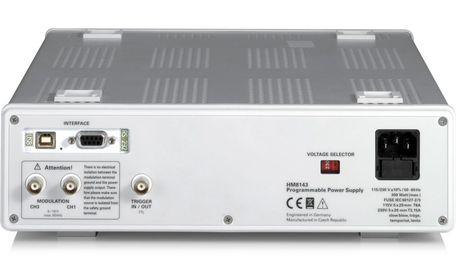 The R&S®HM8143 offers two channels with up to 30 V source and sink functionality plus one source channel with 5 V. Electronic fuse and modulation inputs are additional features.